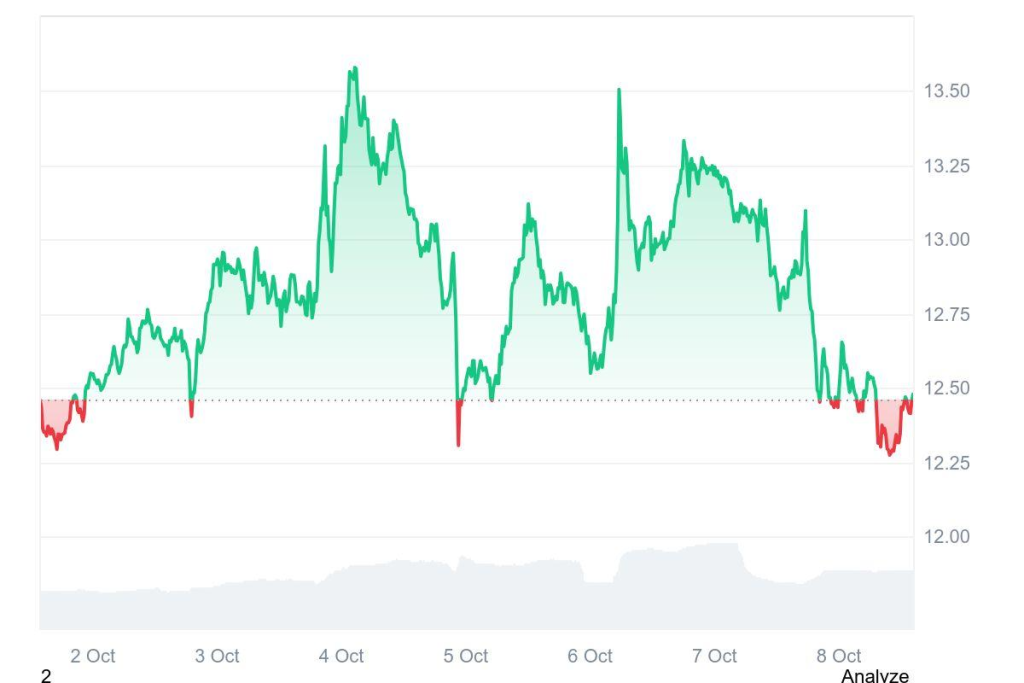 The token is currently trading at $12.42, with a market cap of $1.24B, and while it’s had a quiet month, price action is turning up. After bouncing off support, INJ appears to be carving out a new base, and if it clears resistance in the $14–$15 zone, analysts see room for growth.