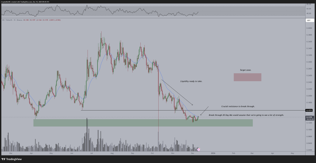 SEI sits near that point today. A push above the 20-Day MA could open the path back toward the $0.16 range. Michaël van de Poppe outlined a clear sequence. A breakout from that range may pull liquidity toward $0.24, with potential room to stretch into the $0.27 area. His view suggests that a full move across this zone could double the value of SEI from recent levels.