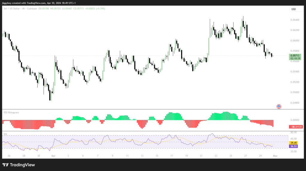 Now it’s slowed down. The SEI price fell back to the $0.056–$0.057 area. The RSI cooled to around 39, so there’s room to go up again if buyers come back. The red bars on the histogram show selling pressure right now, but nothing’s fallen apart yet. As long as the price stays above $0.055, the whole setup is still fine.