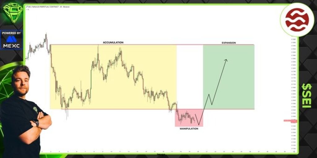 Sjuul’s chart breaks the structure into three clear stages: accumulation, manipulation, and expansion. The SEI price spent weeks in that accumulation box before sliding into the manipulation area, where price briefly breaks down to remove liquidity.