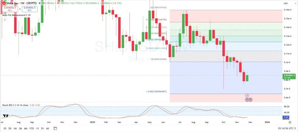 When you zoom out to the weekly chart shared by TheCryptoBasic, the wider trend is still pointing down. Several weeks of red candles have wiped out much of the previous move, and SHIB is still trading below multiple key Fibonacci retracement levels.