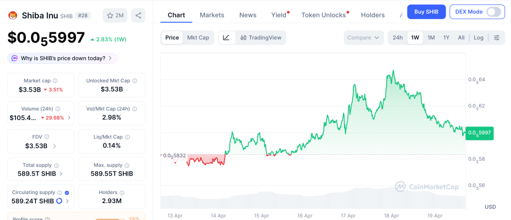 Shiba Inu (SHIB) trades near $0.0000059 on April 19, down 93% from its $0.00008616 all-time high, according to CoinMarketCap. The $3.5 billion market cap token runs Shibarium with thousands of daily transactions and burn rate spikes hitting 237% recently.