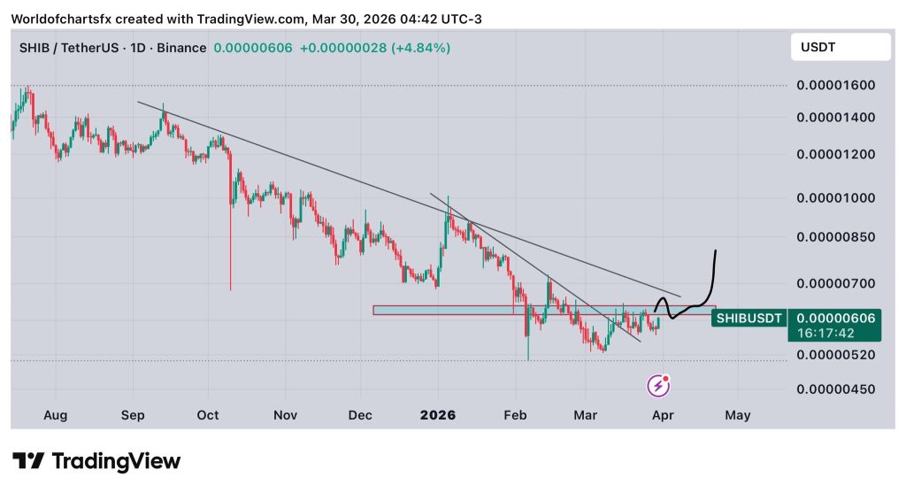 We took a step back and looked at the SHIB chart shared by World Of Charts from a broader perspective, and the overall trend hasn’t changed yet. Since mid-2025, the SHIB price has been locked inside a descending channel, consistently making lower highs and lower lows.