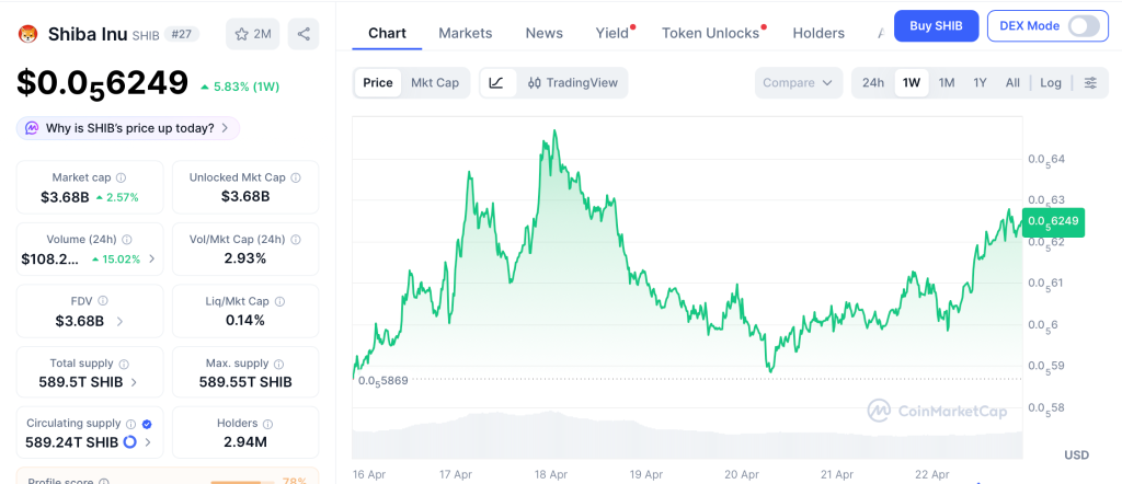 Roughly 505 billion SHIB moved off exchanges on April 21 per CoinMarketCap, following 82.5 billion pulled on April 18 and 229 billion the week prior. The token trades at $0.0000062 at what analysts at The Crypto Basic call the final line of defense near its 2021 lows. Burn activity jumped 237% on April 13 with Shibarium crossing one billion transactions.