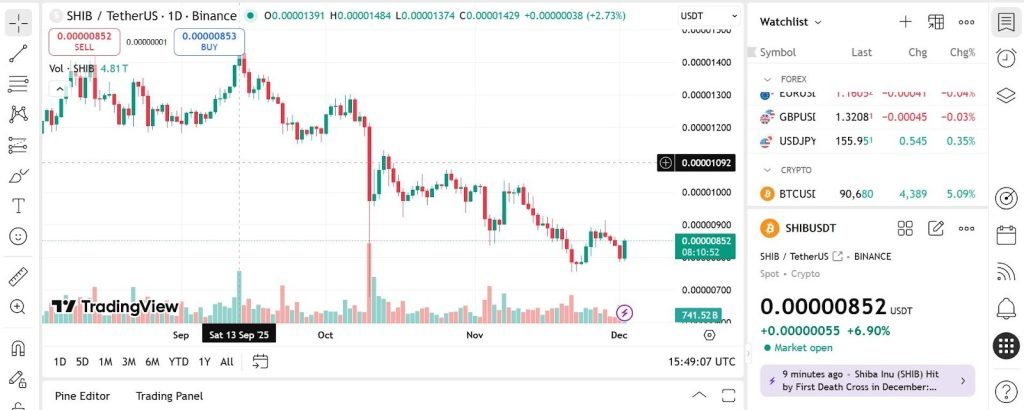At around $0.0000085, Shiba Inu sits on a market cap of roughly $4.9 billion and daily trading volumes above $137 million. The coin is still a major player in the meme ecosystem, but the gap between its current positioning and its all-time high is massive.