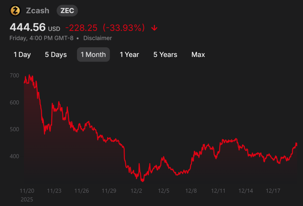 Price action in mid-December reflected that uncertainty. ZEC traded in a choppy range around the high $300s to mid $400s, with rallies fading quickly. Sensitivity to macro risk and regulatory tone remains high, which keeps traders focused on finding confirmation signals.