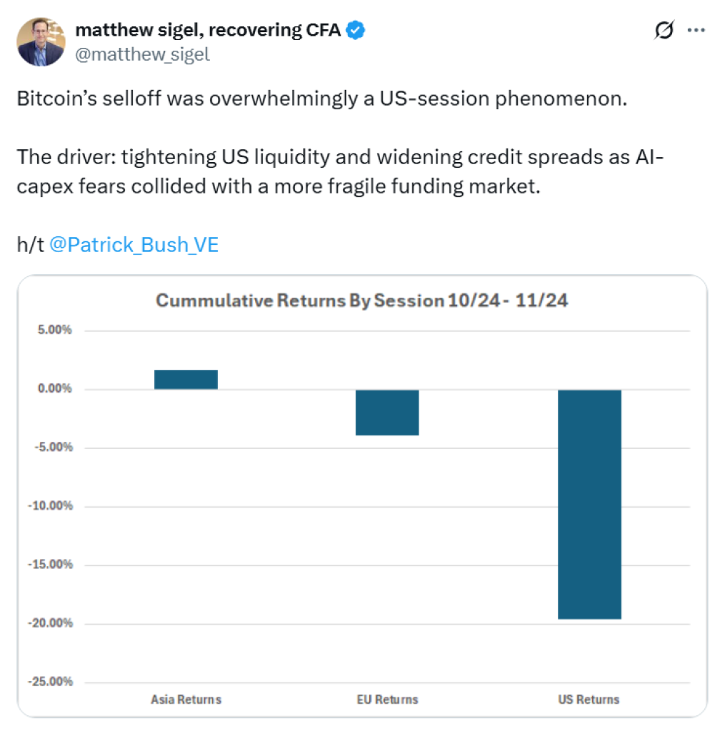 Matthew Sigel, head of digital assets research at VanEck, added that the recent sell-off was mostly driven by United States trading hours. He cited tightening liquidity and widening credit spreads as the main factors, explaining that the cost of large-scale spending tied to artificial intelligence has started to collide with a weaker funding environment.