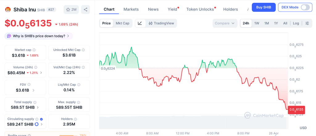 SHIB sits near $0.000006135 per CoinMarketCap, and the $0.000007 wall has rejected every push this month. SHIB ETFs are still missing from the U.S. market, and the Shibarium FHE upgrade slid back to Q2 2026, putting the layer-2 privacy story on hold.