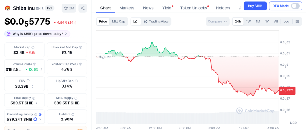 SHIB sits at $0.0000057 according to CoinMarketCap, down 4.94% in that 24 hours, with a $3.4 billion market cap according to CoinGecko.