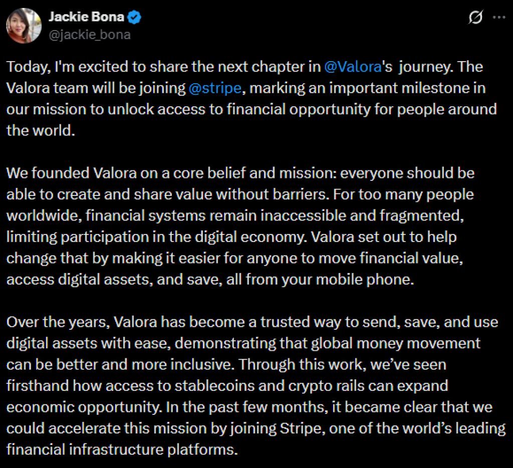 Stripe acquired the team from the Valora Wallet app following the launch of its stablecoin-centric Tempo testnet. The team will likely support Stripe in its blockchain operations.