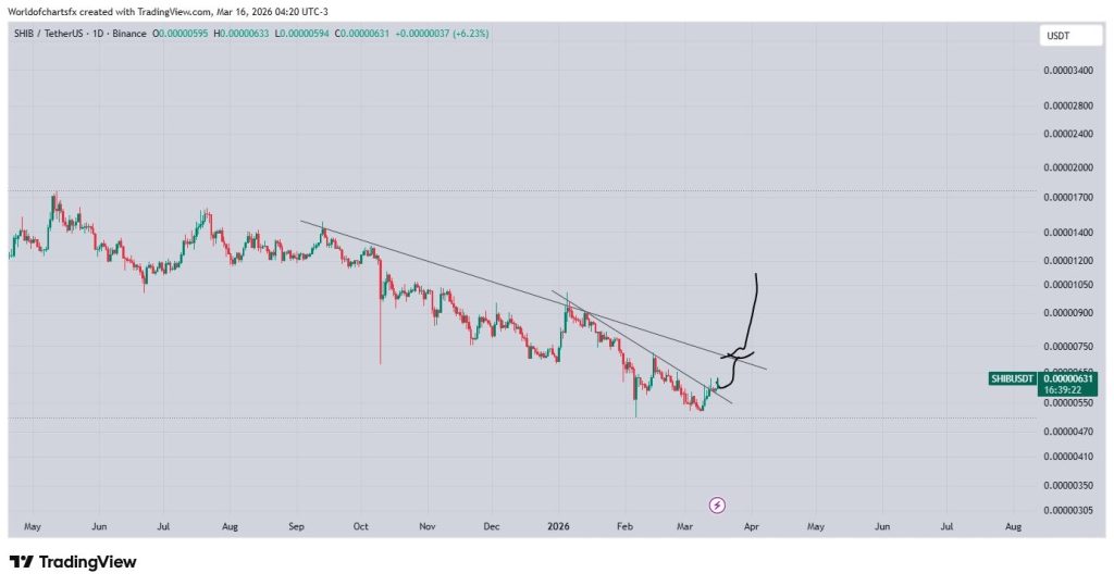 The current SHIB price sits near $0.00000631, up 6.23% on the session. The recent move broke above a shorter-term counter trendline that had been capping price action since the February lows. This breakout represents the first sign that selling pressure may be exhausting and buyers are beginning to step in.