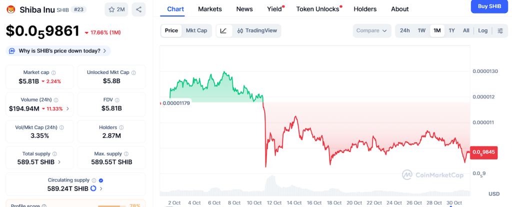 Shiba Inu currently trades near $0.000009861, maintaining strong liquidity and community support. Resistance levels are forming near $0.0000107, $0.0000123, and $0.0000139, while support levels sit at $0.0000091, $0.0000085, and $0.0000078.