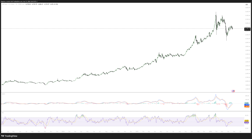 Gold is holding above its recent correction zone after the sharp March drop. The chart shows a big climb, then a deep drop, and now a sideways pause. Price is moving between $4,700 and $4,800, building a base.