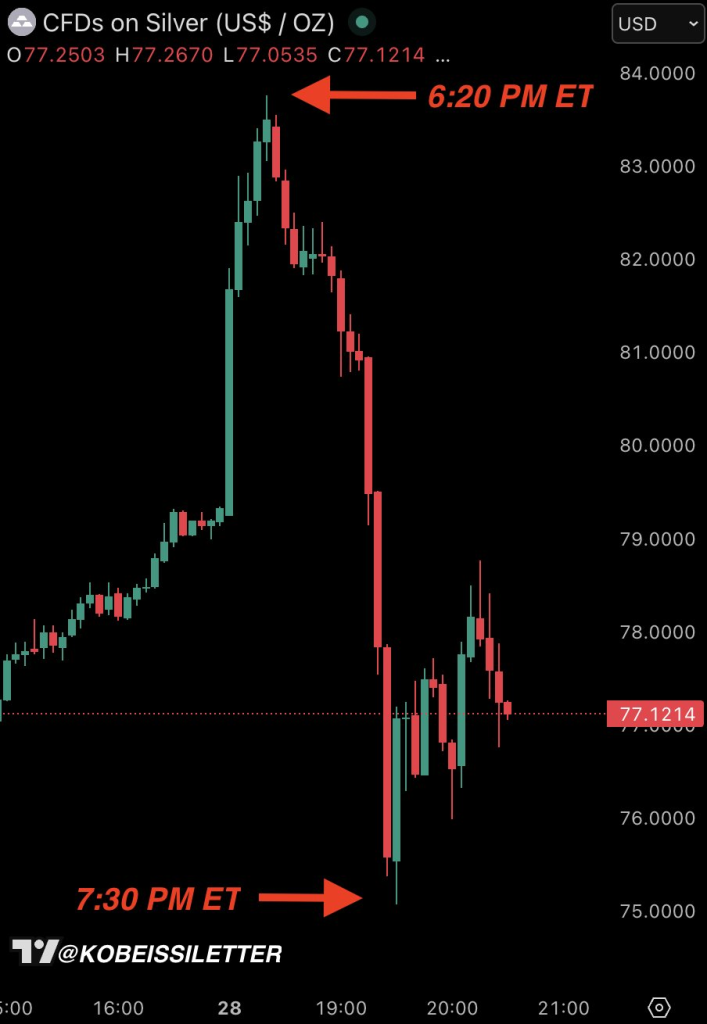 Around 6:20 PM ET yesterday, silver spiked to a record high near $83.75, jumping roughly 6% in just minutes. The move was fast and aggressive, catching many traders off guard.