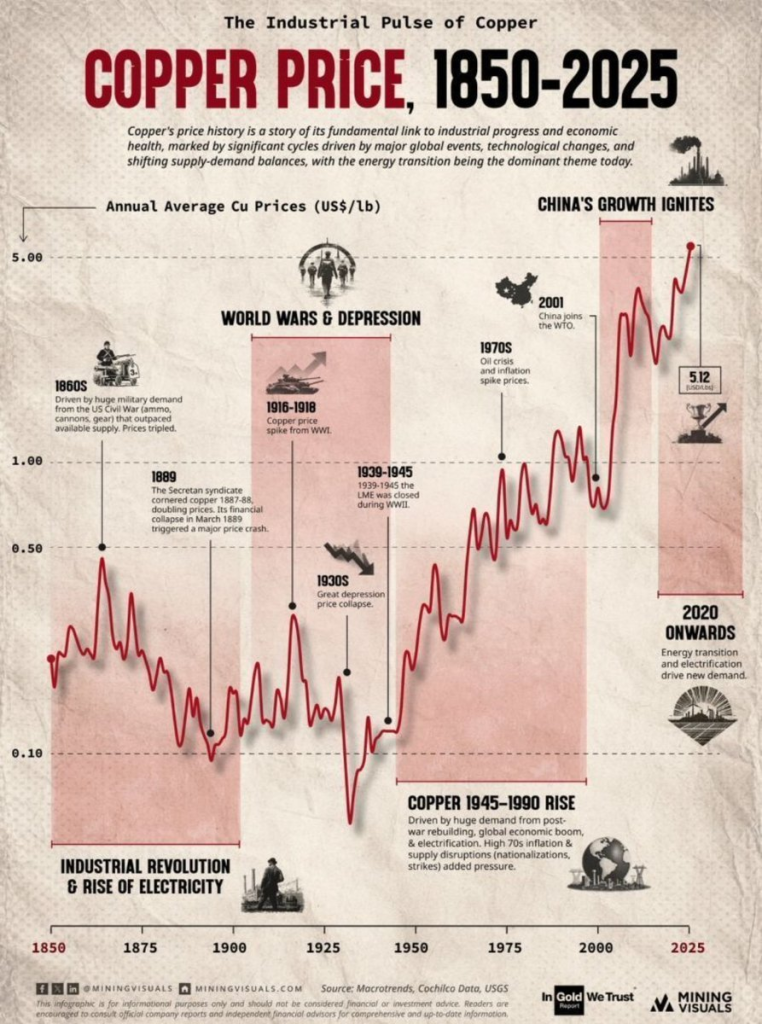Looking back, copper surged during the Industrial Revolution, spiked around both World Wars, rose again during post-war reconstruction, and then entered another long rally as China’s growth ignited global demand in the early 2000s.