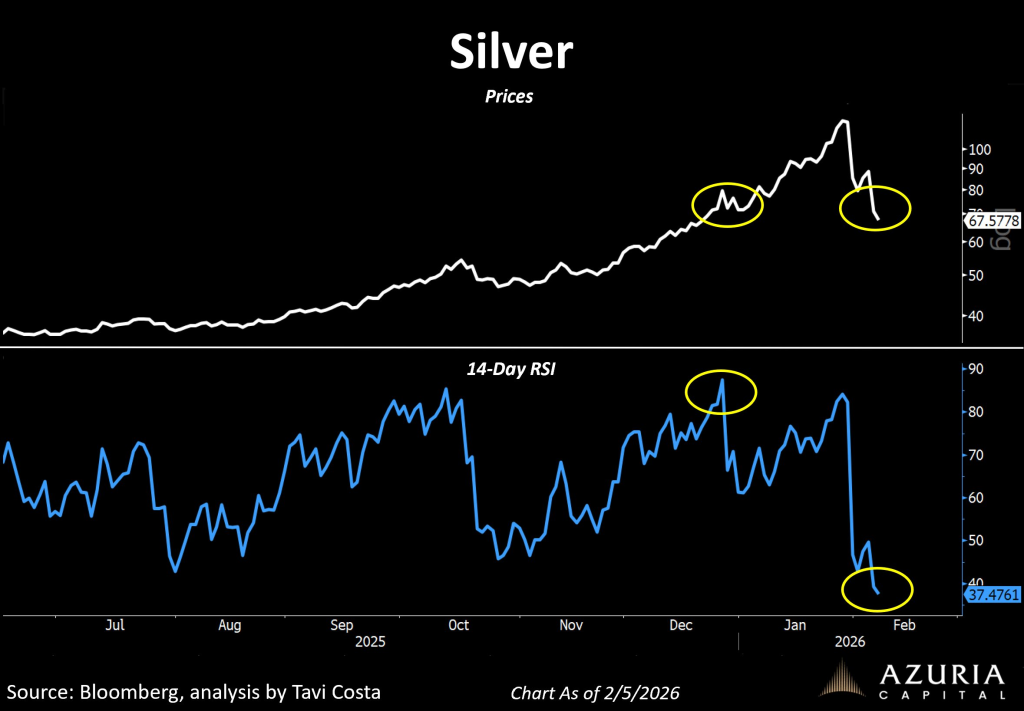 In mid-December, silver was trading near $65 and sentiment was almost euphoric. Momentum was strong, buyers were aggressive, and the technicals reflected it. Costa notes that the 14-day RSI at the time was pushing close to 80, which is typically considered an overheated level.