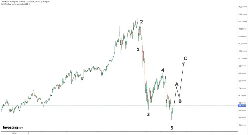 Analyst Rashad Hajiyev thinks the worst part of the decline may already be behind us. In his view, silver just finished a full 5-wave Elliott drop, which is often the kind of structure that shows up near major turning points.