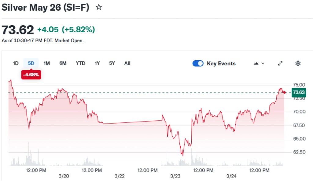 Silver touched $61 per ounce Monday morning. By the time markets got a hint that the bombing campaign was winding down, the price had bounced back $12 to $73. For traders watching the metal, the move was fast.