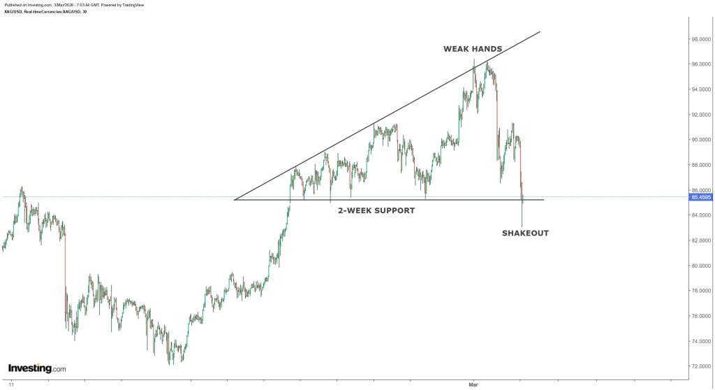 Hajiyev’s tweet focuses on psychology as much as structure. He argues that many participants bought silver during the war-driven pump near the highs. Those late entries were highly sensitive to drawdowns. A 10–14% pullback from the local top is enough to shake out traders who entered for momentum, not conviction.