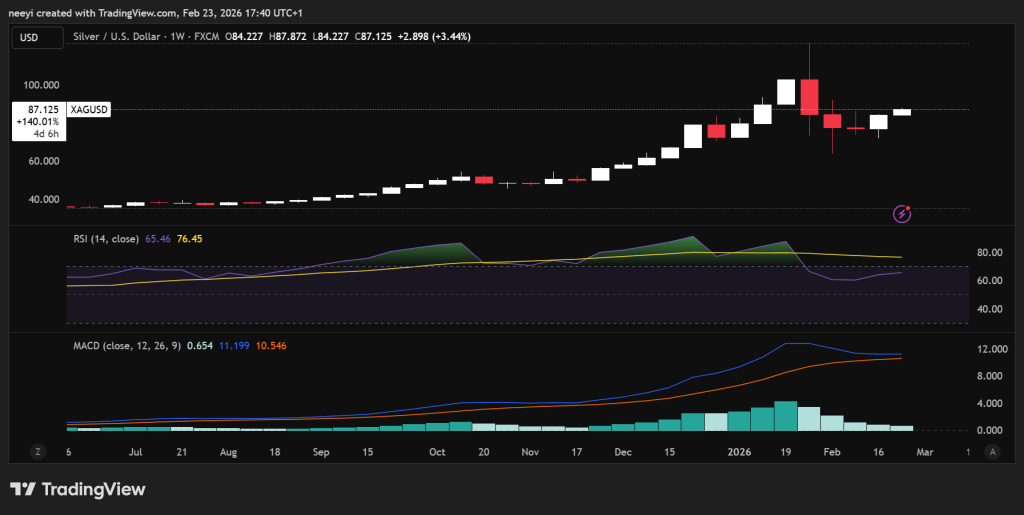 Silver spiked to a high near $121 in January, then price retraced hard. The pullback dragged silver down toward $63 before buyers stepped back in. Silver price has now recovered to around $86 at the time of writing, which puts the market back inside the post peak range.