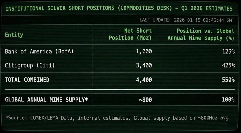 The image he shared breaks the story down into a simple table titled “Institutional Silver Short Positions (Commodities Desk) – Q1 2026 Estimates.”