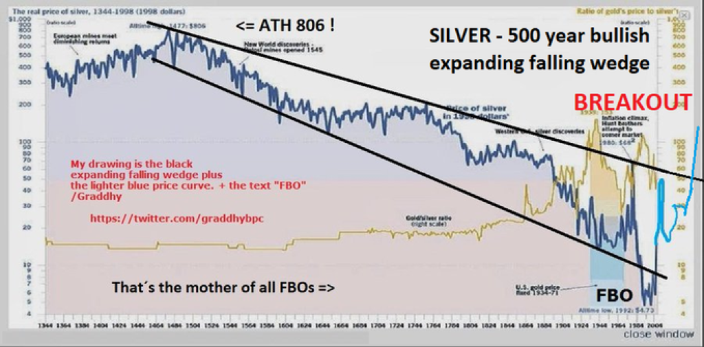 Graddhy’s chart tracks silver prices going back more than 500 years. Over that entire period, silver moved inside a massive expanding falling wedge. Every major rally failed. Every breakout attempt rolled over. The metal stayed locked in decline for centuries.