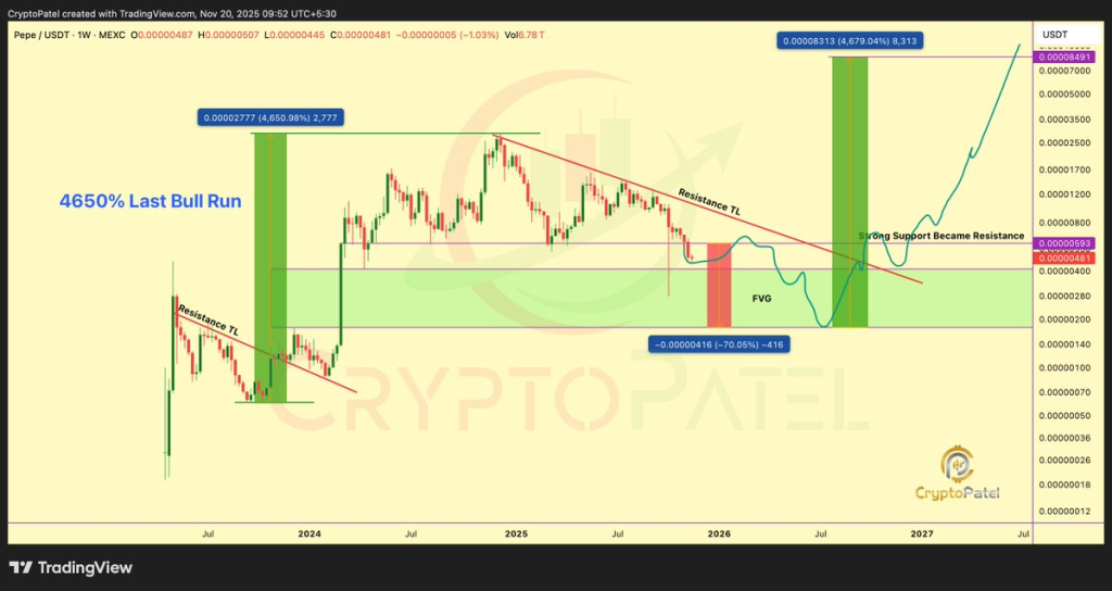 Crypto Patel’s analysis shows that PEPE’s current structure is acting like a spring being compressed. Once the key resistance is reclaimed, Pepe could move sharply higher. This makes watching weekly trends and major resistance levels crucial for anyone tracking Pepe token.