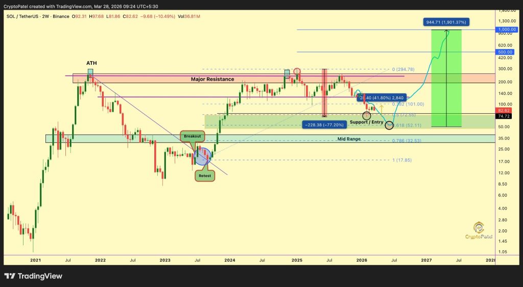 Patel’s accumulation zone is $75 to $45. That’s where he’s looking to add. Not because he thinks it’s the exact bottom. But because that’s the zone where previous cycles have built wealth. His targets are $500 and $1,000. Ambitious. But Solana has done it before.