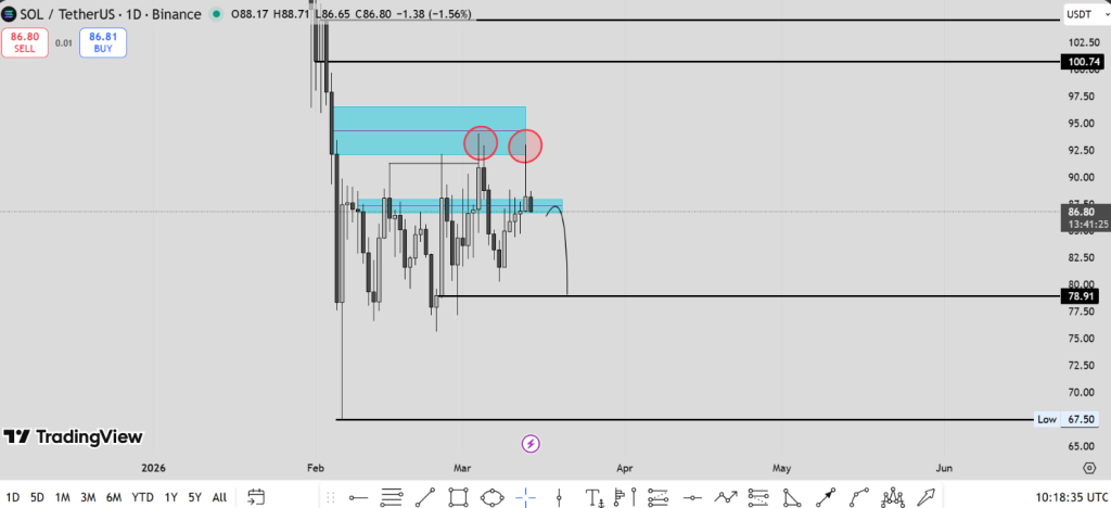 The discussion about Solana has gained traction following a recent analysis by a member of the CoinMarketCap community forum, TEKT0NIC. The analysis revealed a possible double-top formation near $100. The Solana chart on the daily timeframe shows a rejection within a higher-timeframe supply zone.