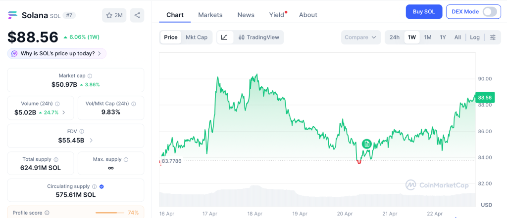 Solana (SOL) trades near $88.56 per CoinMarketCap, up 6.06% on the week after bouncing off $82.93 support on April 19. Resistance sits at $87.10, and a clean close above opens the path toward $92.11 and $97 per Invezz’s April 21 technical read. Support holds at $82.93 with Fibonacci backup at $80.34 if sellers reclaim control.