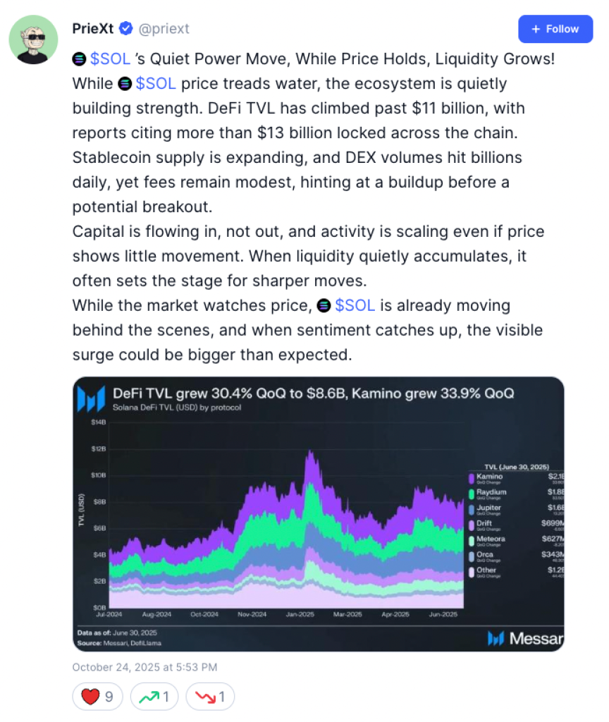 Crypto analysts believe Solana’s recovery looks sustainable. “While SOL’s price treads water, the ecosystem is quietly building strength,” noted Priext, a CoinMarketCap contributor. “When liquidity quietly accumulates, it often sets the stage for sharper moves.”