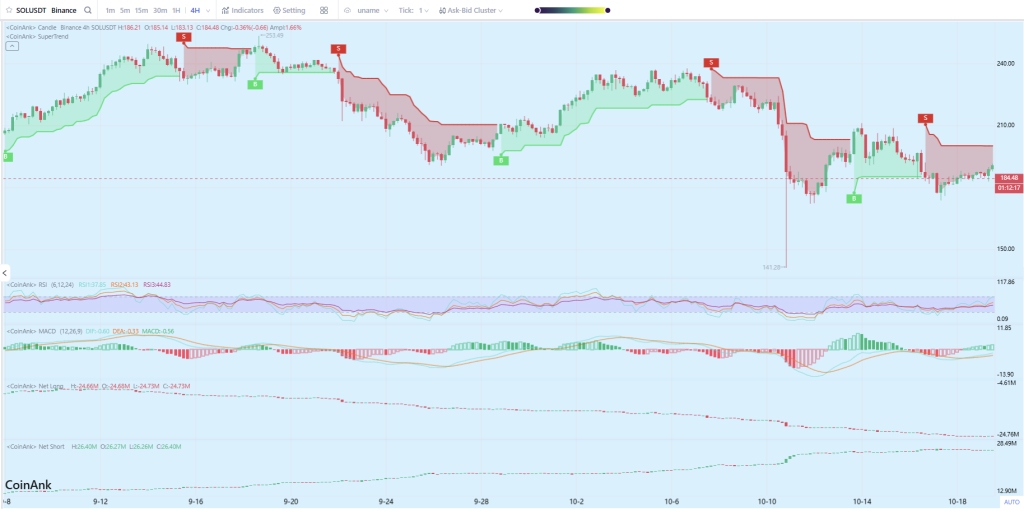 The chart shows Solana trading around the $185 range, where price action has been choppy and directionless. The SuperTrend indicator flipped bearish earlier this month, signaling continued downside pressure. Each failed attempt to break higher has led to lower highs; a classic sign that buyers are running out of steam.