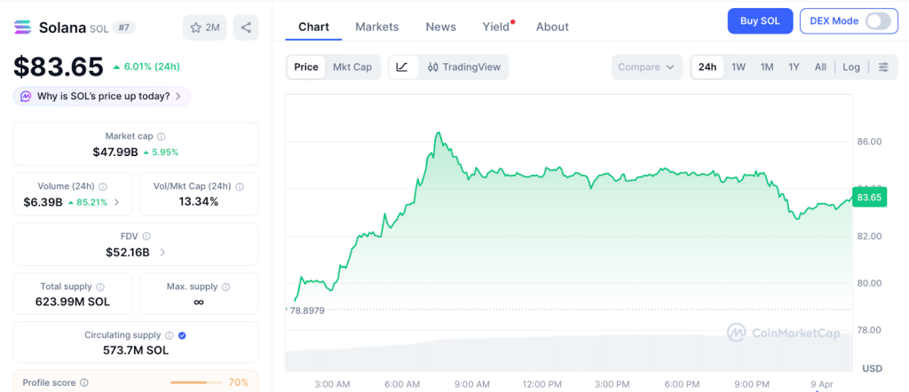 SOL trades at $83.65 according to CoinMarketCap, 73% below its $293 peak. Standard Chartered targets $250, VanEck sees $3,211 by 2030, and InvestingHaven’s analyst average sits near $425.