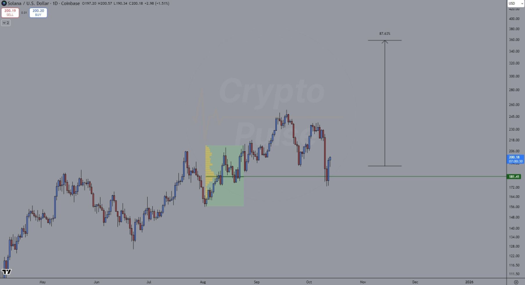 On the daily chart, Solana’s price has found consistent footing near the $200 zone, a level that has acted as both resistance and now support. The green line on the chart – around $181.41 – marks the lower boundary of this broader support region. Each time price dips near it, buyers have stepped in, keeping the broader uptrend intact.