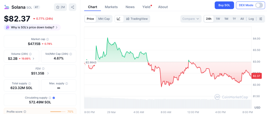 SOL trades at $82.37 according to CoinMarketCap, after rejection near $97 resistance.