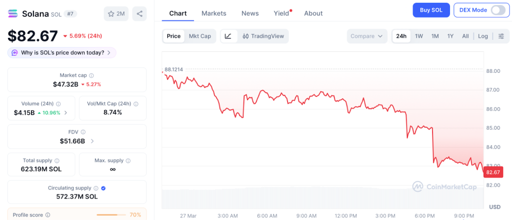 Solana trades at $82.67 as of March 27 after a 5% daily drop and 72% decline from its $294 ATH, with the 52 week low at $68 in late February, according to CoinMarketCap.