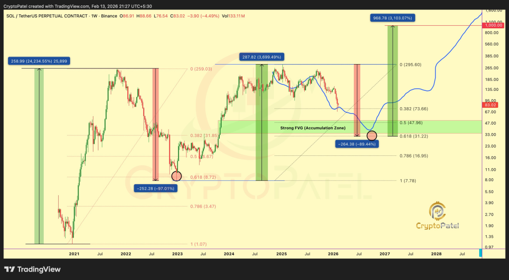 Crypto Patel points to Solana’s first major cycle between 2020 and 2021, where price moved from about $1.07 to nearly $260. That rise represented an extraordinary percentage expansion before a deep correction pulled SOL down close to $7.78.