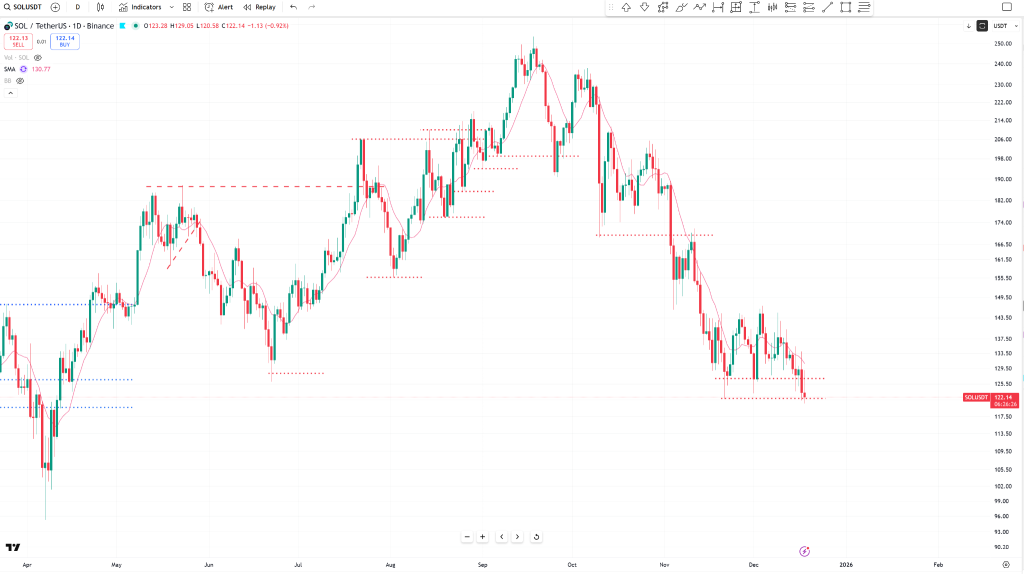 Right now, the SOL price is trading near $122 after a long slide from its highs above $240. Some holders are pointing out that the price is already down more than 50% and sitting near support. That’s true. But the way price is behaving indicates the pressure hasn’t fully played out yet.