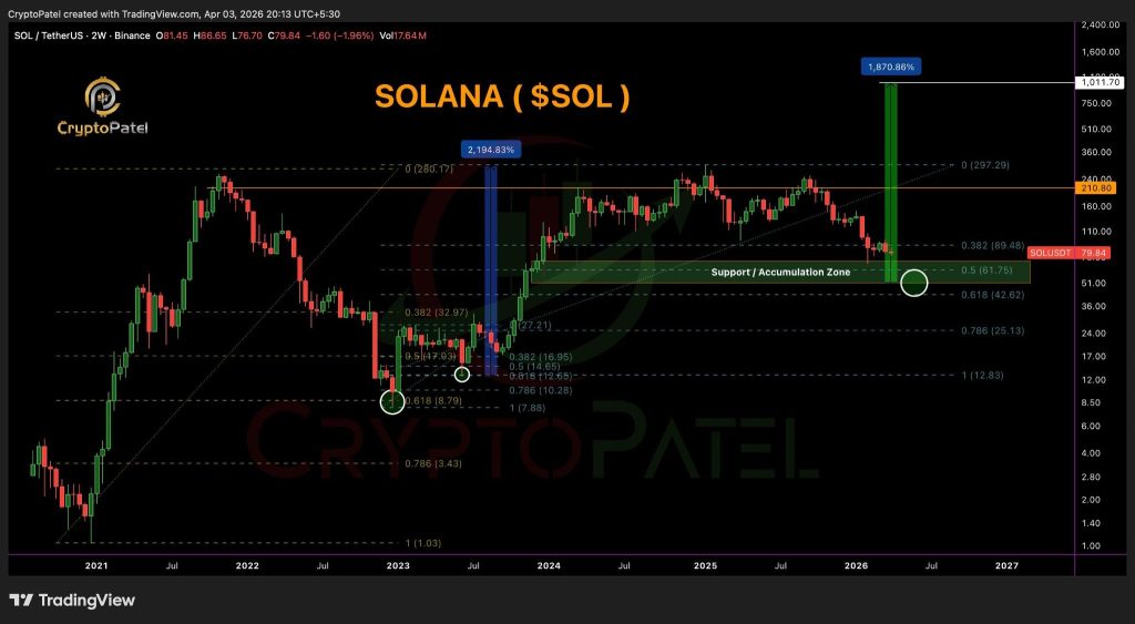 To get a sense of what could come next, it helps to glance at the past. Patel shared a chart showing the last cycle, Solana hit around $280 at its peak in late 2021, then plunged all the way down to roughly $8.79. That crash erased almost all of its value, but it also set a clear bottom for the next move.
