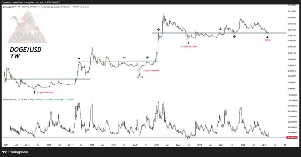 Dogecoin is back in focus after reclaiming the $0.10 level. However, it has fallen back below $0.95. Cryptollica believes DOGE is entering its fourth macro cycle. According to him, there’s a rare alignment of structural support and exhausted selling pressure.