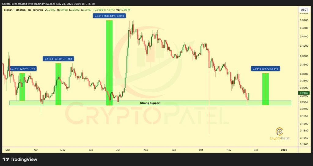 The bullish case doesn’t rely on the wedge alone. Crypto Patel highlighted that the XLM price just touched the same $0.20–$0.22 support band that previously triggered rallies of 32%, 53%, and even 138%. That’s a pretty strong track record.