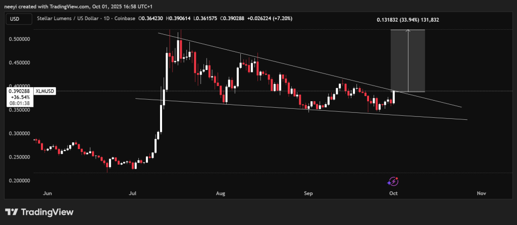 The chart shows XLM price approaching the upper boundary of the wedge around $0.39 to $0.40. A breakout from this level would be a strong signal that Stellar could be ready for its next rally. The first major target in such a breakout scenario sits near $0.52, which would represent about a 30% jump from current levels.