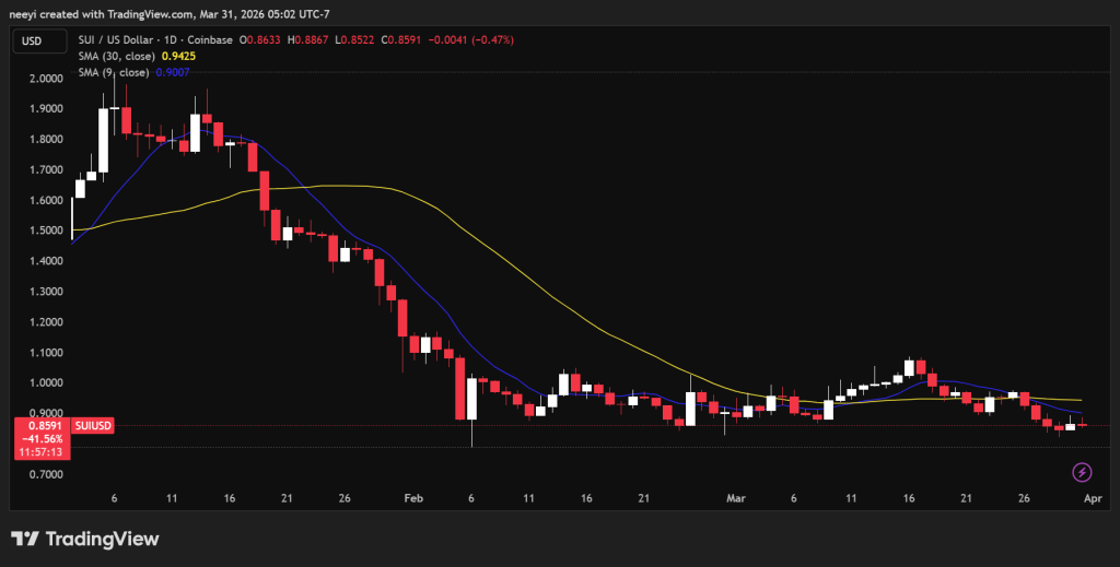 The larger 2026 picture now looks more like an extended repair phase or a base-building attempt than a confirmed bullish reversal. SUI price remains below the 30-day and 200-day moving averages, and the 30-day line itself remains below the 200-day line. That structure usually points to a market stuck in a bearish or sideways regime.