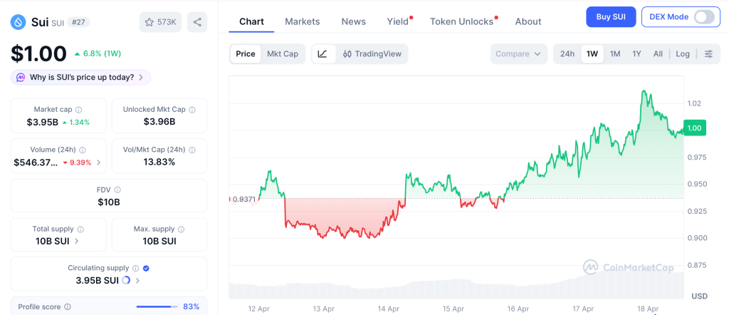 SUI trades at $1.00 per CoinMarketCap, down 81% from its $5.35 ATH posted January 2025. The Changelly forecast for April pegs the SUI range at $0.61 to $0.88, while the CoinPedia bull case targets $5 by December, roughly 405% upside.