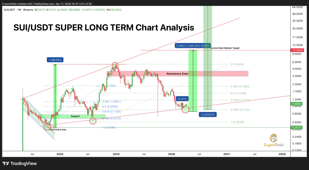 SUI price pushed back above the $1 level this week, and that move has brought renewed focus to a setup that many had already written off earlier in the year. The recovery did not come out of nowhere. Price respected a key support zone near the lower Fibonacci levels and bounced from a long term trendline that has been guiding the structure since early cycles.