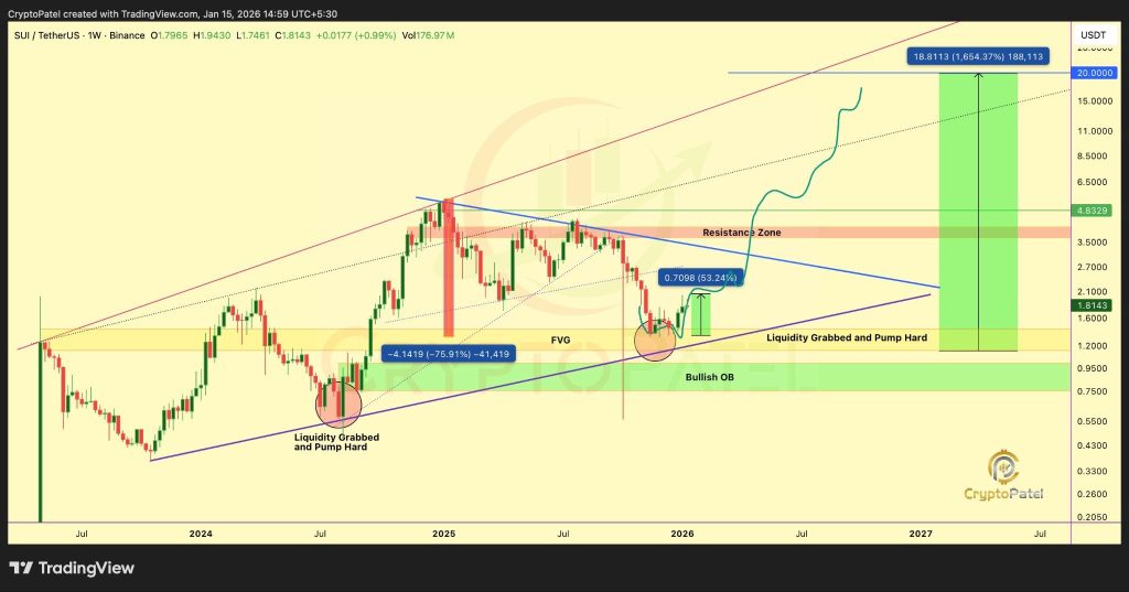 On the weekly chart shared by Patel, the SUI price completed a clear liquidity sweep below previous lows. That move flushed out weaker hands before price quickly reversed, a pattern that often points to smarter positioning behind the scenes. The rebound started inside a strong weekly bullish order block between $1.30 and $1.50, a zone that price respected cleanly.