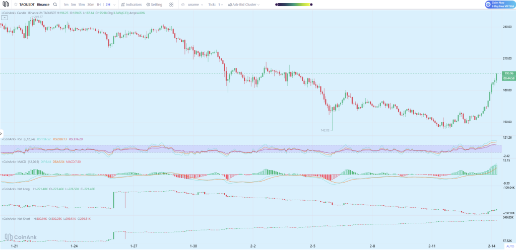 On the 2H chart, TAO carved a long, grinding downtrend with lower highs, then flipped hard into a vertical reclaim. The latest candles are almost straight up into the ~$196 zone, which is exactly what a momentum ignition looks like after a base forms.