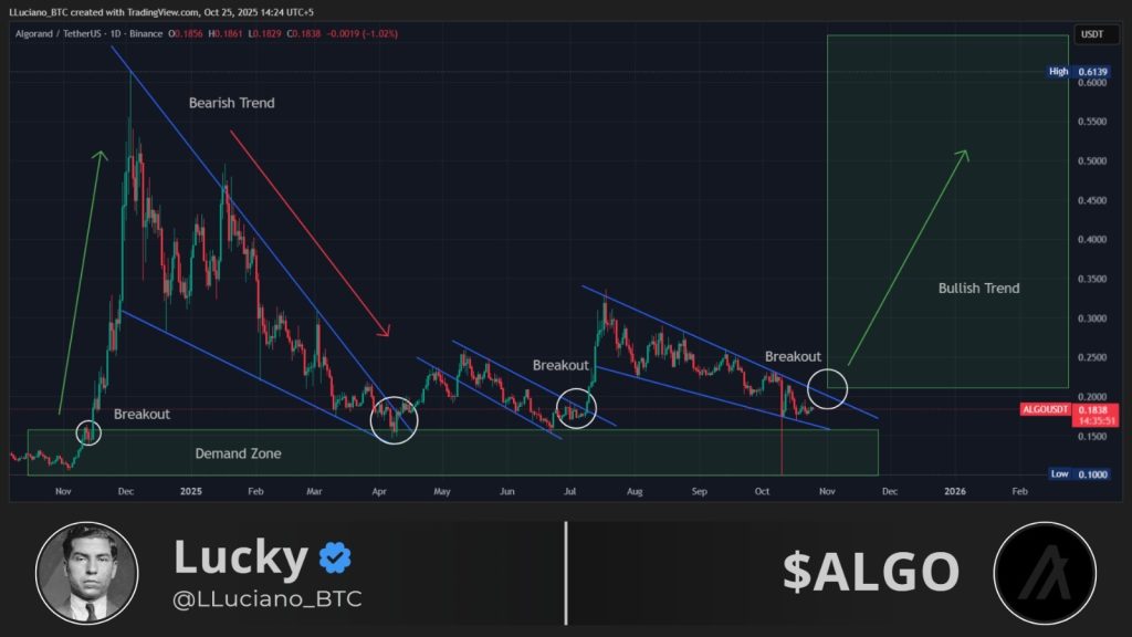 Another analyst, Lucky Luciano, spotted something interesting too. His chart shows that ALGO price has spent most of this year repeating the same pattern, falling wedges followed by strong breakouts.