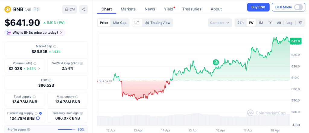 BNB (BNB) trades at $641 per CoinMarketCap after climbing 5% on the burn news, backed by easing US-Iran tensions and broader crypto strength.