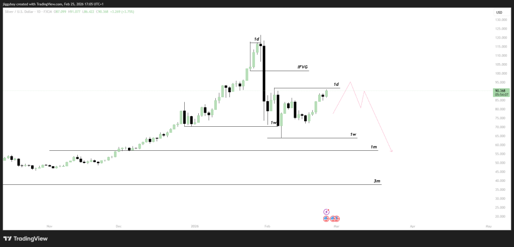 Since then, price has been stabilizing and forming higher lows, working its way back toward the $90–$95 area. This zone is important because it previously acted as a ceiling. The last time silver reached it, sellers overwhelmed buyers and forced a deep pullback.